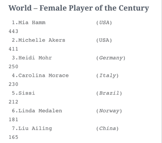 在女足方面,美国传奇球员米亚-哈姆以443分当选20世纪最佳女足球员,美国人阿克斯、德国人摩尔排名2、3位,中国球员刘爱玲、高红、孙庆梅、范运杰都入围33人的名单,其中刘爱玲高居第7,高红排名第12,孙庆梅排名第18,范运杰排名第26。