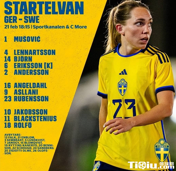 可以很明显地感觉到瑞典女足对德国队这场比赛的态度,首发阵容中后卫线同时出现了三名效力英超的球员,分别是来自埃弗顿队的比约恩、来自切尔西队的约娜·安德森和玛格达莱娜·埃里克松,再加上来自意甲尤文图斯队的老将琳达·森布兰特,而上一场对中国队时只有老将比约恩一个人坐镇。同时前锋线效力于拜仁慕尼黑队的索菲亚·雅各布松也首发出场了。