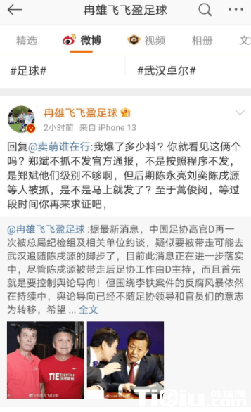 据悉,爆料蒿俊闵的是前央视《足球之夜》专职足球记者、前《体坛周报》名记,足球专家冉雄飞。目前冉雄飞的IP属地在美国。随着李铁被带走调查,冉雄飞突然活跃起来,不断的通过自己的社交媒体各种“爆料”,一下子吸引来不少粉丝。很多不明真相的群众都为他叫好,认为他是揭露足坛黑恶势力的“第一人”。不过很快,冉雄飞就被微博官方给禁言了。如果仔细看一下冉雄飞之前的言论,他曾经公开表示,中国足协的某D姓领导是大毒瘤,在足协安插的都是自己的人,直接把陈戌源架空了。还表示,D姓领导前不久被带走问话。矛头直指杜兆才。甚至还指责海南琼中女足有部分巨额欠款下落不明。这也遭到了足球圈一众大V的嘲讽,认为他是没新闻制造新闻。
