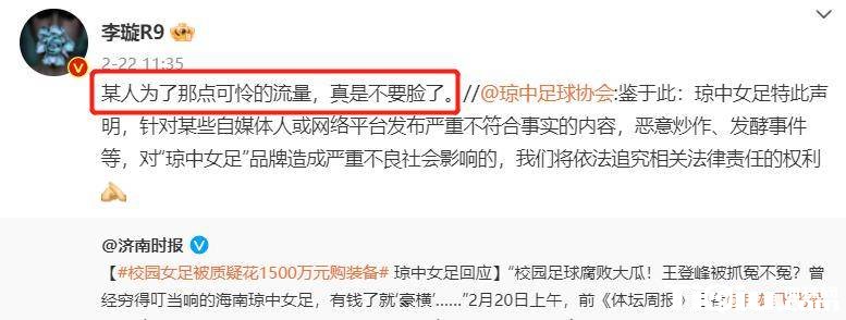 李欢写的是某人因为交通不畅丢了面子,所以这也是一个旁白。有些人只是想引起注意,但孙文值得人们信任。他本人参与了女子足球队的事务。再加上中国足协琼中女足的传闻,可见孙雯没有问题。