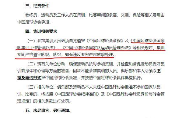 说到集训公告,最重要的核心自然是入选球员的名单,但是很多细心的球迷可能已经注意到,在公告下方的集训要求中,除了老生常谈的,对于第一届时,新加入的玩家必须遵守和的规定。这两项规定中,一是刻意强调国家队集训期间的规定,二是强调国足球员的行为规范。总之,足协要对国家队进行一次“整顿”。