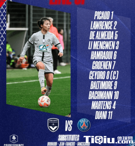 北京时间3月5日凌晨, 法国女足杯1/4决赛,巴黎圣日耳曼顽强淘汰波尔多女足,常规时间0-0平局,点球以5-4胜出,胜利进入法国女足杯4强。中国女足留洋后卫李梦雯再次代表大巴黎首发出场,并且踢满了全场90分钟的比赛(赛事规定90分钟内踢平,不会进入加时赛,直接踢点球决胜),点球决胜过程中,李梦雯没有出场,出场的5名球员全部将球罚进,波尔多女足罚进4球,加尔比诺罚丢点球,使得大巴黎点球顺利晋级。