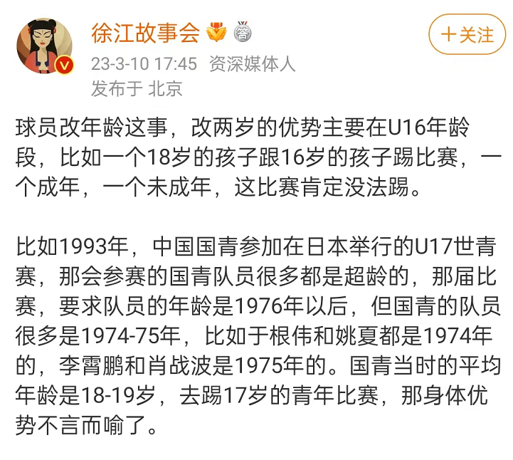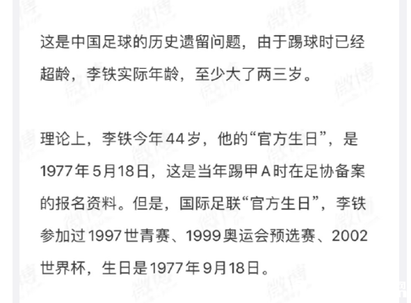 前记者徐江甚至爆料,在李1993年17岁以下世青赛(常被称为世青赛)上,很多国青年龄偏大。其中,于根伟和姚夏都74岁了,李霄鹏和肖战波都75岁了。按照当时的要求,76岁以上的运动员参加。就这样,青年国家队获得了明显的体能优势,2:2战平智利国家队,最终排名第14位。