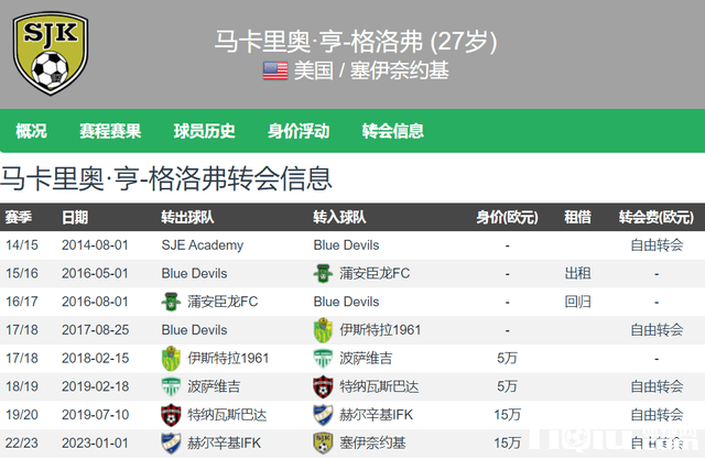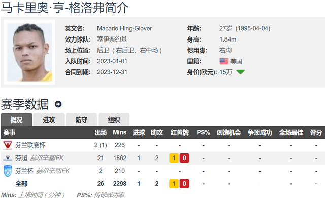 据德转数据显示,现年27岁的晏新力,身高1.84米,右脚球员,主打右后卫位置,也可以踢右中场和中卫,没有代表美国国家队或者青年队出战过,目前球员在德转的身价为15万欧元。