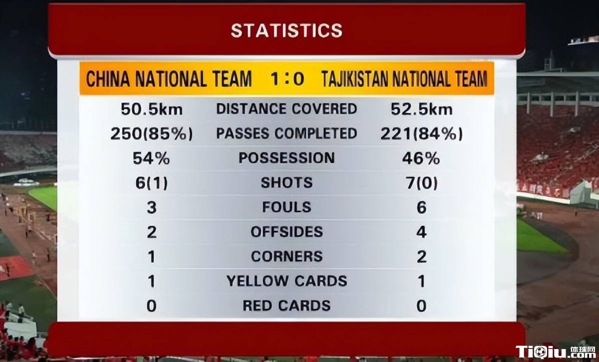 从上半场的统计数据看,国足跑动略少于对手,射门数也6比7处于劣势。只是塔吉克斯坦的射门效率偏低,比赛经验不足,最终国足1-0险胜。