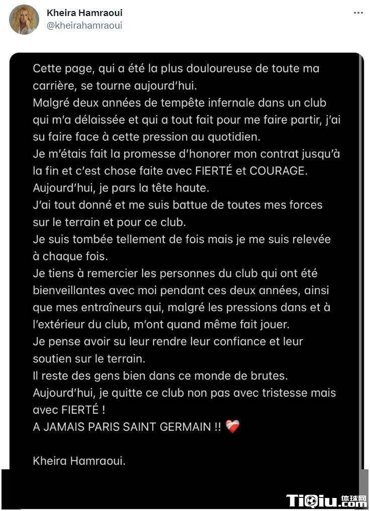 国内足球 时间:2023-05-29 20:47来源:编辑:燕归今天,法国女子足球联赛中巴黎圣日耳曼俱乐部的球员伊娃-哈姆拉威日前宣布正式离队,并在离队声明中对俱乐部管理层进行批评。她表示自己在俱乐部的时候受到了不尊重和歧视,这是她选择离开的主要原因之一,同时,她还是在球队中遭遇过一场悲剧。