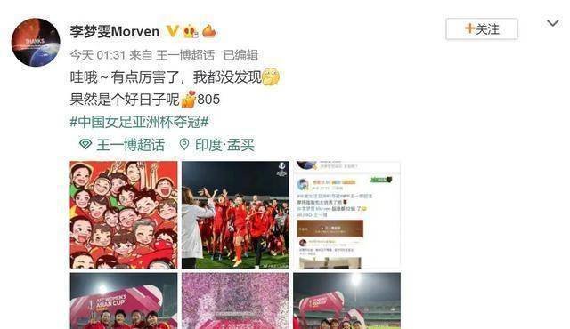 相信很多网友都和爪爪君一样,到现在还沉浸在女足夺得亚洲杯冠军的喜悦里。时隔十六年再次登上了冠军宝座,不得不高呼一声:了不起的女足姑娘!当然,除了女足夺冠这个好消息之外,女足姑娘李梦雯也迎来了她追星的高光时刻:原来李梦雯也是一枚货真价实的摩托姐姐!从王一博超话的打卡记录可以看到,她已经连续打卡805天,而夺冠之夜也正是打卡第805天这个特殊的日子!李梦雯发博:“哇哦~有点厉害了,我都没发现,果然是个好日子”,并且比心805。
