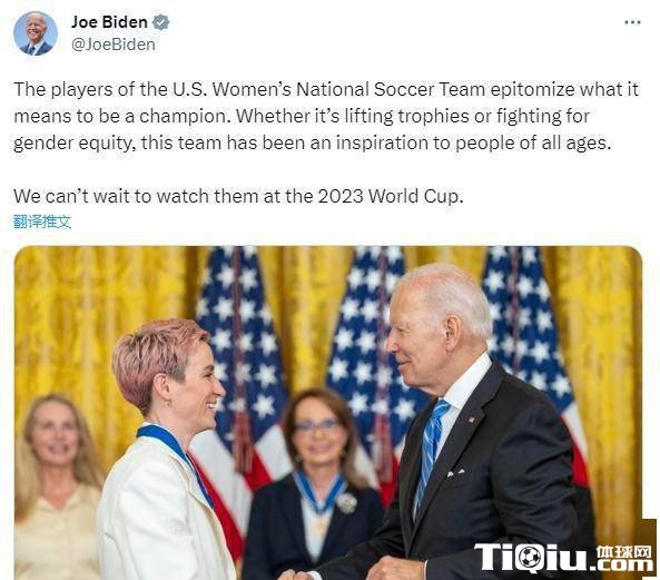 国内足球 时间:2023-06-22 16:36来源:编辑:燕归如今,女足世界杯大战在即,全球女足整顿待发,也相应公布了参加女足的球员名单,也包括刚刚公布的美国女足名单,近日,美国总统乔-拜登今天在推特发文,向参加女足世界杯的美国女足国家队表达了支持,表达了“所有人的灵感来源,期待你们在世界杯的表现”。