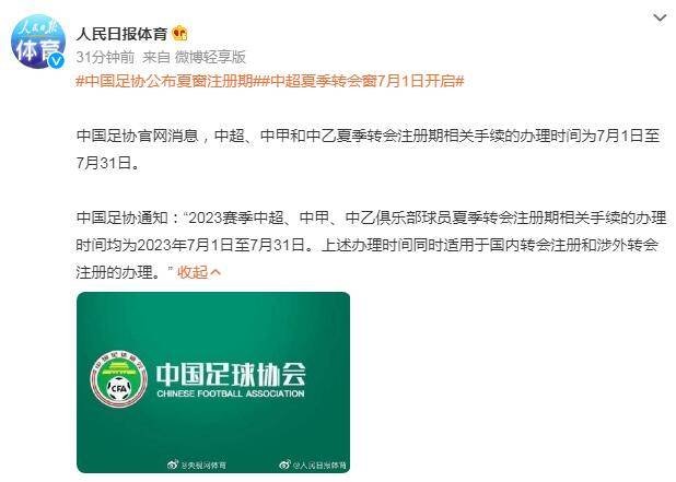中国足协的通知中写道:“为保证2023赛季中超、中甲、中乙俱乐部球员转会注册工作的顺利进行,我会于2023年2月21日发布了足球字﹝2023﹞107号《中国足球协会关于2023赛季中超、中甲和中乙俱乐部球员转会注册工作有关事宜的通知》。现将上述通知中有关第二个转会窗口(即夏季转会注册期)的有关事宜通知如下——2023赛季中超、中甲、中乙俱乐部球员夏季转会注册期相关手续的办理时间均为:2023年7月1日至7月31日。上述办理时间同时适用于国内转会注册和涉外转会注册的办理。”