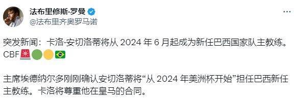 7月5日,巴西足协主席埃德纳尔多在接受《Globo》采访时证实,安切洛蒂将在明年6月担任巴西男足主帅。