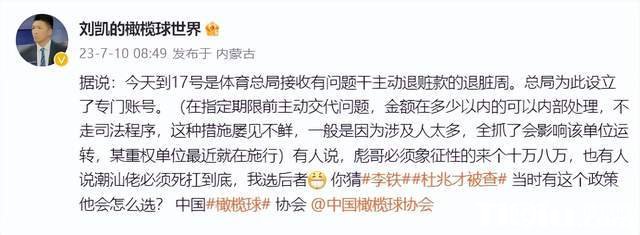 现在据媒体人刘凯的透露,从今天到17号是体育总局接收有问题主动退赃款的退赃周,总局为此设立了专门账号,就是在指定期限前主动交代问题,金额在多少以内的可以内部处理,不走司法程序,因为涉及人太多,全抓了会影响该单位运转。