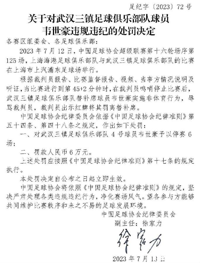 国内足球 时间:2023-07-18 19:43来源:编辑:燕归在北京时间7月18日下午,武汉多家球迷协会联合发布了一篇名为:《湖北武汉各球迷协会致国家体育总局公开信》的文章,以此来表达对中国足协重罚韦世豪的不满。同时,文中表达了球迷对本赛季中超开赛以来,武汉三镇队在赛场上遇到不公判罚、双标判罚等现象提出了质疑。