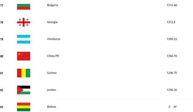 中国男足国际排名重新跌至世界第80位
