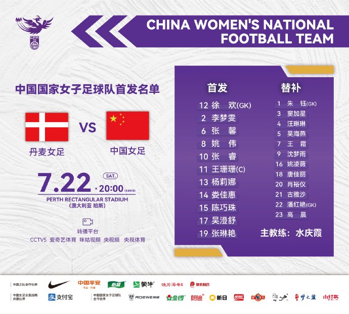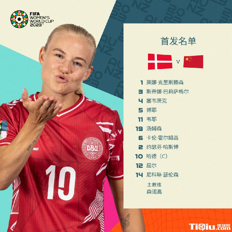 丹麦女足首发:1-莱娜-克里斯滕森、3-斯蒂娜-巴利萨格尔、4-塞韦茨克、5-博耶、11-韦耶、19-汤姆森、2-约瑟芬-哈斯博、6-卡伦-霍尔姆高、12-屈尔、14-尼科琳-瑟伦森、10-哈德