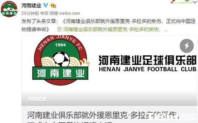 河南建业正式表态 多拉多受伤向足协提请申诉