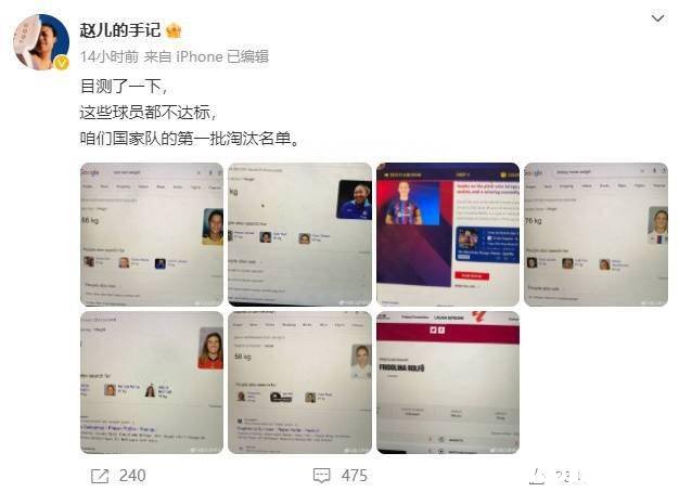 此前赵瑜洁分享了克尔、劳伦斯-詹姆斯、普特拉斯、霍兰等欧洲、澳洲女足球员体重信息,质疑女足选人标准,她写道:“目测了一下体重,这些球员都不达标,咱们国家队的第一批淘汰名单”。