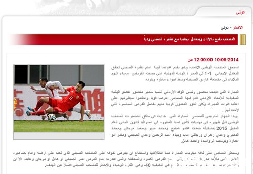 国内足球 时间:2014-09-10 16:50来源:未知编辑:浅月【导读】北京时间9月9晚,约旦与中国的国际A级热身赛在哈尔滨进行。最终,中国队在最后阶段被对手扳平,以1∶1收获平局。全场比赛国足表现吃力,约旦队则占尽优势,射门次数更是高达到16比4。对此,在本场比赛结束后,约旦足协刊登了标题为《满意约旦男足表现,与中国队战平结果乐观》的评论文章。
