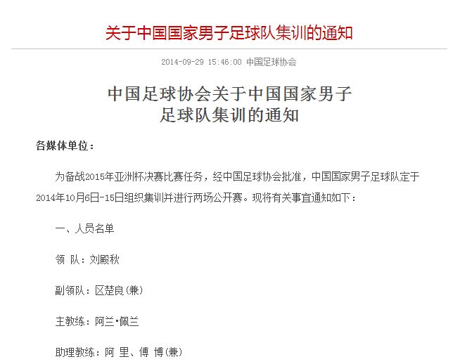 ¡¡¡¡Îª±¸Õ½2015ÄêÑÇÖÞ±¾öÈü±ÈÈüÈÎÎñ£¬¾Öйú×ãÇòлáÅú×¼£¬Öйú¹ú¼ÒÄÐ×Ó×ãÇò¶Ó¶¨ÓÚ2014Äê10ÔÂ6ÈÕ-15ÈÕ×éÖ¯¼¯Ñµ²¢½øÐÐÁ½³¡¹«¿ªÈü¡£ÏÖ½«ÓйØÊÂÒË֪ͨÈçÏ£º