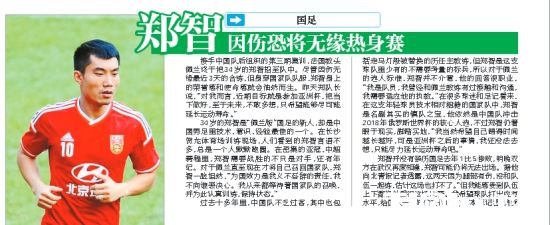 国内足球 时间:2014-10-09 10:40来源:未知编辑:浅月【导读】北京时间10月9日讯,国足即将在明晚迎来与泰国队的热身赛。在昨天下午的新闻发布会上,老将郑智出席并强调为国效力是至高的荣誉,既然出席了赛前的新闻发布会,按照惯例郑智将有望在中泰之战中获得首发。然而据《北京青年报》消息,对于在佩兰执教期间首次入选国家队名单的老将郑智来说,很有可能将因为腿伤错过这场中泰之战。