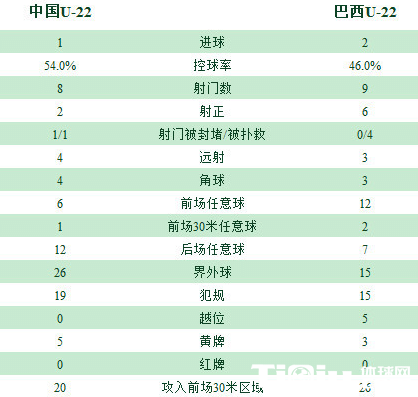 虽然对手是强大的巴西国奥,不过中国国奥还是以54%的控球率占据了一定的主动,射门次数上,中国队8-9仅落后对手1次,但射正次数,巴西队6-2则是完全压制了中国队。在前场任意球数据上,巴西队12-6两倍于中国,为了抵挡对手凶狠的进攻,中国队还付出了5张黄牌的代价,攻入前场30米危险区域的次数,中国队20-26落后对手6次,1-2的比分完全可以接受。