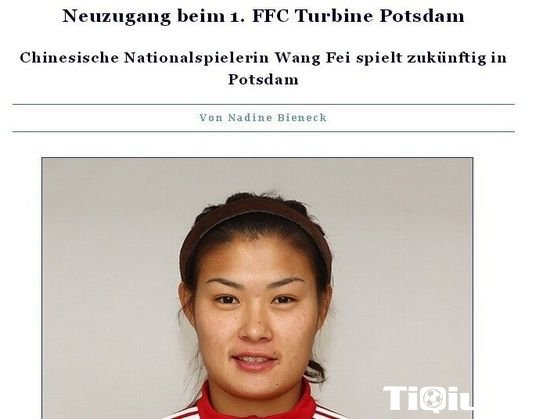 国内足球 时间:2014-12-18 11:30来源:未知编辑:浅月【导读】北京时间12月17日,中国女足门将王飞正式登陆女足德甲。德甲劲旅波茨坦涡轮机俱乐部在其官方网站上正式宣布,中国女足国家队门将王飞将在明年1月加盟,合同期至2016年6月30日结束,王飞也成为了首位登陆女足德甲的中国球员。