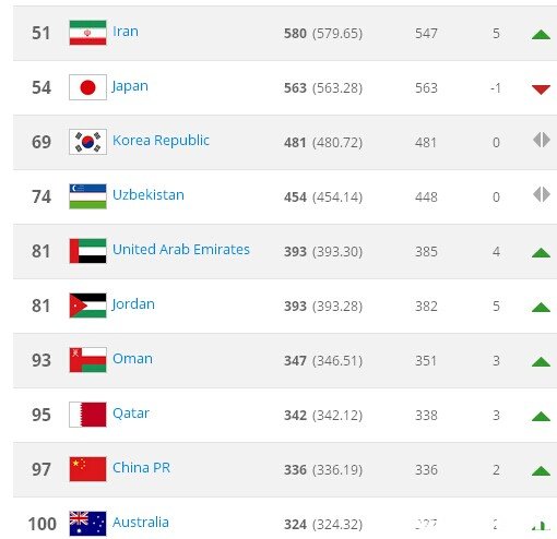 亚洲范围内,伊朗排名亚洲第1,排名2-10位的分别是日本、韩国、乌兹别克斯坦、阿联酋、约旦、阿曼、卡塔尔、中国和澳大利亚。