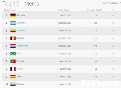 从排名上来看,位居2-10位的分别是阿根廷、哥伦比亚、比利时、荷兰、巴西、葡萄牙、法国、西班牙和乌拉圭。世界前50名中,欧洲球队一共占据了30席,非洲拥有11席,南美球队占据6席,中北美及加勒比海地区则有3队。