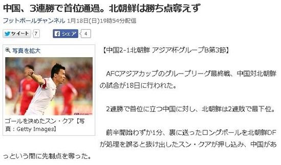 国内足球 时间:2015-01-19 13:44来源:未知编辑:浅月【导读】中国队亚洲杯小组赛三战全胜晋级淘汰赛,日本雅虎体育以《中国三连胜小组第一出线,朝鲜队一分未得出局》为题对中朝之战进行了报道,日本网友称中国队在未来将会让日本队大吃一惊。