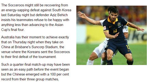 国内足球 时间:2015-01-21 15:12来源:未知编辑:浅月【导读】当地时间1月20日,《悉尼先驱晨报》刊登了对澳大利亚后卫阿齐兹-比伊奇的采访,他表示尽管中国队在小组赛中三战全胜,但澳大利亚实力更胜一筹,没有理由不打进半决赛。