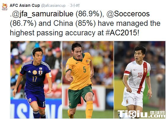 国内足球 时间:2015-01-30 14:39来源:体球网编辑:浅月【导读】当地时间1月30日,据亚洲杯官方推特公布,本届亚洲杯传球成功率排名前三的球队分别是日本(86.9%)、澳大利亚(86.7%)和中国(85%)。