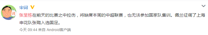17日的亚冠比赛中,张呈栋就感觉腿部不适,但由于不是很明显,没有及时检查。18日上午,张呈栋随受伤的宋博轩和赵和靖一并去检查,结果显示拉伤。