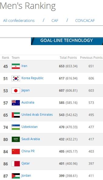 亚洲前十名球队的具体排名如下: