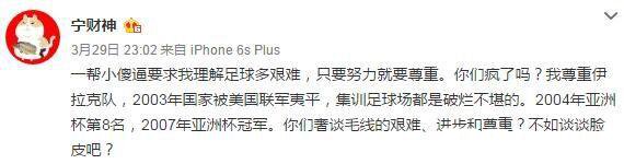 ËæºóºÍ²ËÍ·±íʾ£¬Ö»ÓÐÒÁÀ¿ËÄÇÑùµÄÇò¶Ó²ÅÖµµÃ×ðÖØ£¬“Ò»°ïСɵxÒªÇóÎÒÀí½â×ãÇò¶à¼èÄÑ£¬Ö»ÒªÅ¬Á¦¾ÍÒª×ðÖØ¡£ÄãÃÇ·èÁËÂð£¿ÎÒ×ðÖØÒÁÀ¿Ë¶Ó£¬Õâ¸ö¶àÔÖ¶àÄѵĹú¼Ò£¬¼¯Ñµ×ãÇò³¡¶¼ÊÇÆÆÀò»¿°µÄ¡£2004ÄêÑÇÖÞ±µÚ8Ãû£¬2007ÄêÑÇÖÞ±¹Ú¾ü¡£ÄãÃÇÉÝ̸ëÏߵļèÄÑ¡¢½ø²½ºÍ×ðÖØ£¿²»Èç̸̸Á³Æ¤°É£¿”