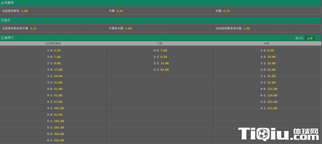 比分赔率方面,乌兹别克斯坦主场1-0小胜的赔率仅为5.50,两队1-1或者0-0战平的赔率分别为6.50和7.00。乌兹别克斯坦主场2-0取胜的赔率为7.50,2-1取胜的赔率为9.00。而国足1-0小胜的赔率为8.50,2-0获胜的赔率高达19.00。从比分赔率方面来看,博彩公司也是看好乌兹别克斯坦主场拿到3分,但国足也有从客场带走1分的希望。