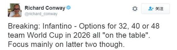 理查德-康威在推特上写道:“因凡蒂诺说‘2026年世界杯的参赛队伍32支、40支或48支的方案都在考虑当中’,估计主要考虑后面两种。”