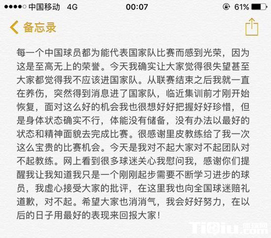 《足球》:赛后,你在微博上发表了一个道歉,说“希望大家消消气,我会好好努力,在以后的日子里用最好的表现回报大家”。还解释了自己的身体情况,为什么发道歉信?