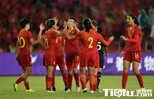 1月19日,中国队球员在比赛中庆祝进球。 当日,在2017年“春辉物流杯”中国足协佛山国际女足锦标赛中,中国队以2比0战胜泰国队。