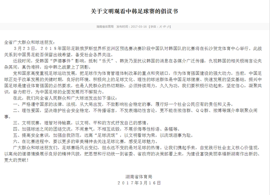 昨天,湖南省体育局在其官网上发出《关于文明观看中韩足球赛的倡议书》,希望球迷理性爱国,不闹事,远离足球流氓。