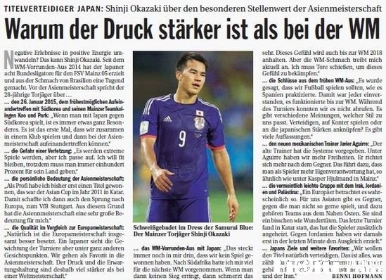 国内足球 时间:2015-01-07 11:48来源:未知编辑:浅月【导读】一个有趣的统计,德甲联赛是为本届亚洲杯贡献球员最多的非亚洲联赛,甚至比澳大利亚和韩国联赛还多。这其中的贡献当然少不了目前庞大的日本旅德军团。其中的代表,无疑是效力于美因茨的冈崎慎司。日前在接受德国《踢球者》专访时,冈崎认为日本队出战亚洲杯的压力超过世界杯,还道出了与日本争冠的其他四支球队。
