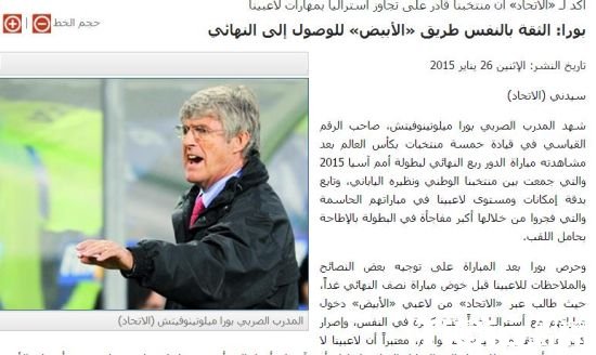 国内足球 时间:2015-01-26 14:57来源:未知编辑:浅月【导读】澳大利亚亚洲杯今天正式开始半决赛的较量。前中国主帅米卢也在几天前抵达了悉尼,观摩了阿联酋和日本的8强战。在接受媒体采访时,米卢盛赞本届亚洲杯精彩纷呈,堪称小世界杯,而表现突出的阿联酋基本上有资格代表亚洲参加2018俄罗斯世界杯。