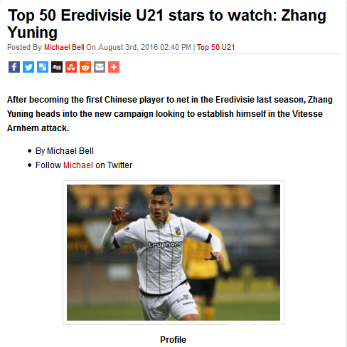 国内足球 时间:2016-08-05 11:11来源:新浪编辑:斯拉克张玉宁入选荷甲50大新星