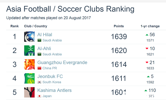 本次俱乐部排名统计数据截至2017年8月20日,北京时间8月22日发布。在亚洲俱乐部方面,广州恒大以1614分排名亚洲第3位,与上期排名相比上升1位。沙特豪门阿尔希拉尔积1639分,排名亚洲第1位。沙特阿尔阿赫利排名亚洲第2位,积分为1620分。韩国全北现代排名亚洲第4位,积分为1611分,比广州恒大少3分。日本鹿岛鹿角排名亚洲第5位,积分为1601分。阿联酋豪门阿尔艾因排名亚洲第6位,积分为1593分。在世界范围内,广州恒大是唯一一家进入TOP100的中国俱乐部,位居世界第88位,较上期提升5位,广州恒大排在瓦伦西亚、布鲁日、南安普顿等俱乐部之前。