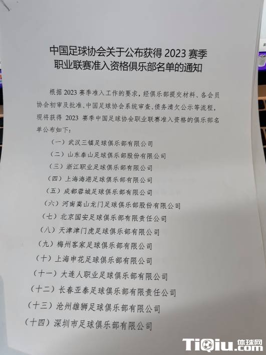 根据 2023 赛季准入工作的要求,经俱乐部提交材料、各会员协会初审及批准、中国足球协会系统审查、债务清欠公示等流程,现将获得 2023 赛季中国足球协会职业联赛准入资格的俱乐部名单公布如下: