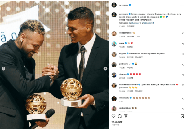 而目前内马尔也是参加在巴西举办的颁奖典礼,虽然如今内马尔早都不是世界前十的超级巨星了。但在这个巴西国内媒体人举办的颁奖典礼上,内马尔还是得到了两个奖项。这也让内马尔相当开心,在颁奖典礼上吐露了自己的心声。内马尔表示:“说实话我从来没有想到过我可以得到这些奖项,我一直以来的梦想就只有身穿巴西国家队球衣,为国家奋战。能够得到这个奖项的认可,我非常地开心荣幸”。