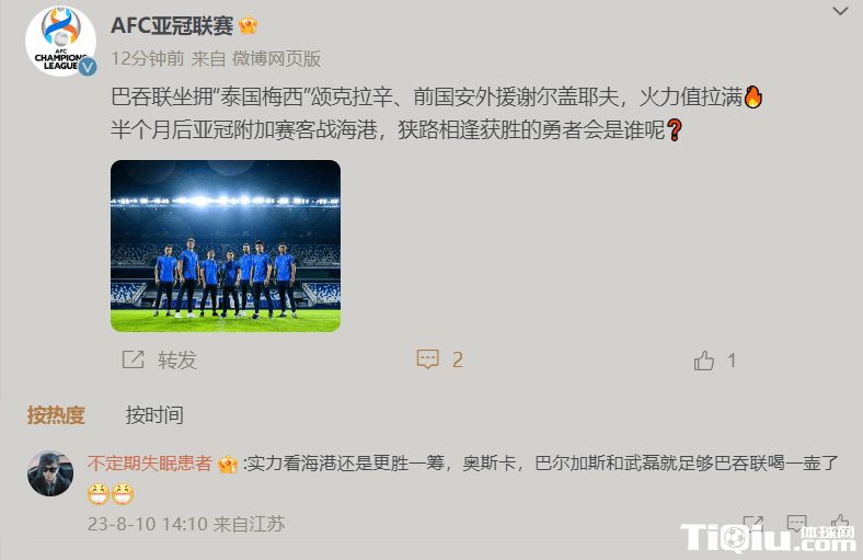 亚冠官微点名泰超第八名 上海海港遭挑战球迷表达不满