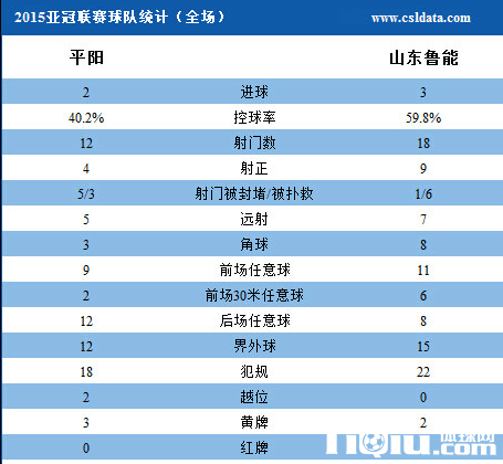 鲁能在数据方面占据了明显的优势,控球率接近于六成(59.8%-40.2%)。射门数上以18-12高出对手,射正上也以9-4高出。鲁能在定位球上亦是占据优势,其中角球以8-3领先,前场任意球以11-9领先。一连串的数据占优,也说明鲁能队的胜利在情理之中。