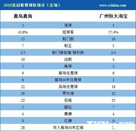本场比赛,两支球队从数据统计上看难分高下。控球率上广州恒大57.4%-42.6%领先,攻入前场30米区域上也31-28稍稍占优。但鹿岛鹿角在打门(13-10)、角球(5-3)、前场定位球(9-6)等数据上占据了优势,最终2-1战胜广州恒大,证明了日本球队的进攻效率更高。