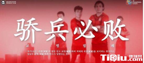 国内足球 时间:2015-05-27 14:04来源:未知编辑:浅月【导读】今晚,2015亚冠联赛1/8决赛,广州恒大主场迎战城南FC。赛前,恒大曾发布了本场对决的海报:惜败不损信念,广州不容挑衅。不过,对手城南FC官方将恒大海报改成了“骄兵必败”,除了文字外,城南FC并未对恒大的原版海报进行大面积的改动,此举极具挑衅意味。