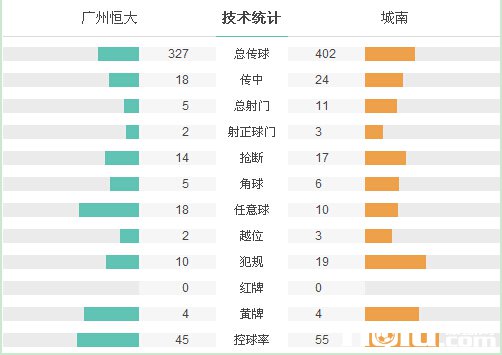 恒大在攻势方面要处于下风,射门以5-11落后于对手,射正也以2-3落后。任意球方面,恒大则以18-10高出城南。控球率方面,恒大以45%-55%落后。不过恒大在效率上更胜一筹,这也帮助球队最终取胜。