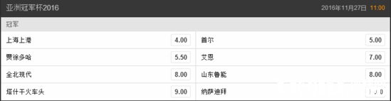 亚冠各队最新夺冠赔率 上港稳居榜首鲁能倒数第三